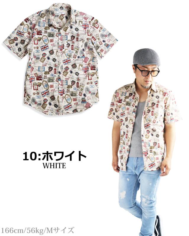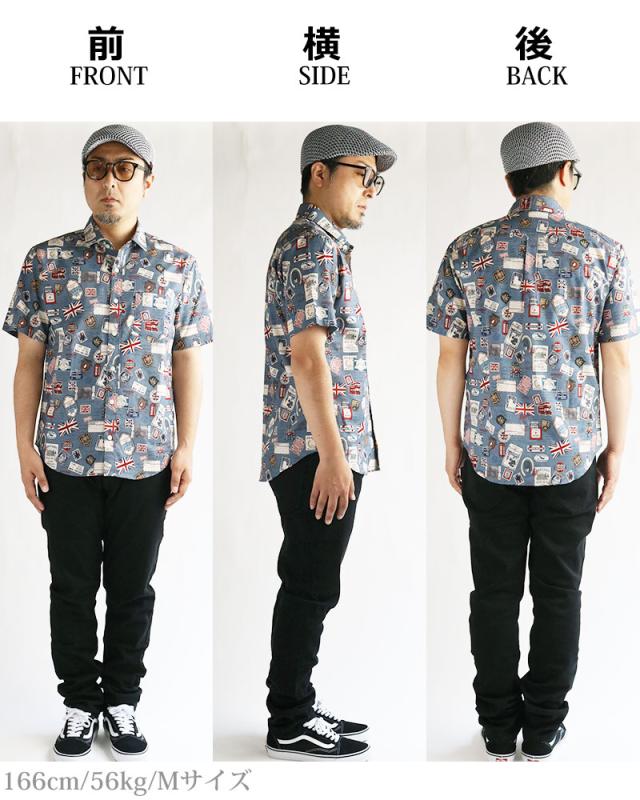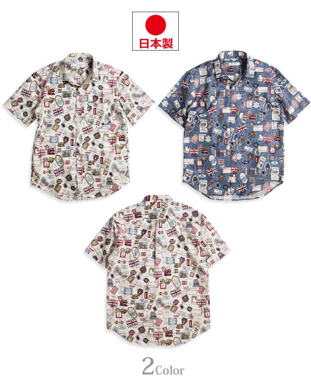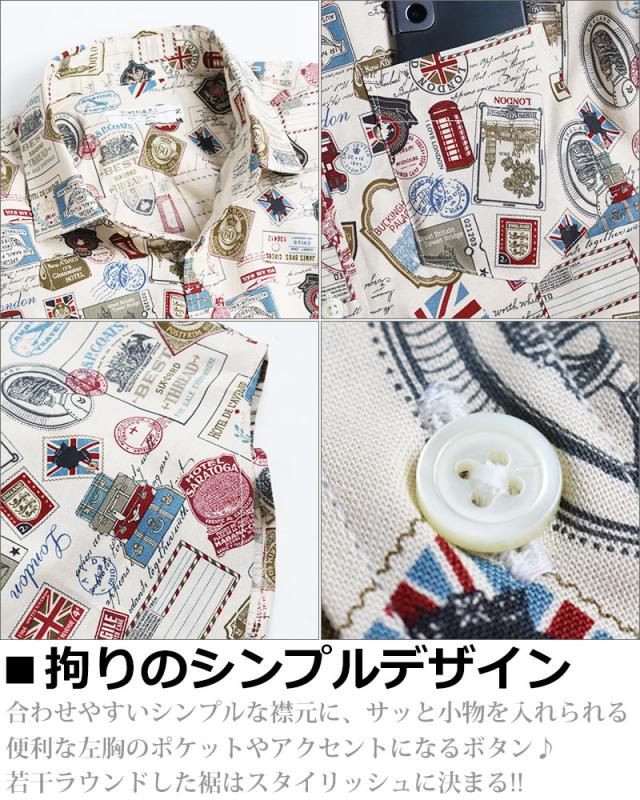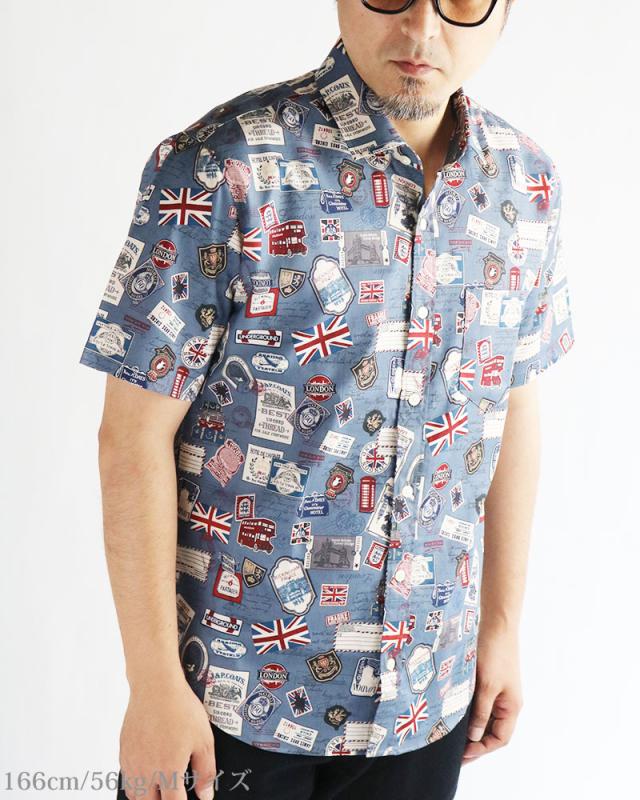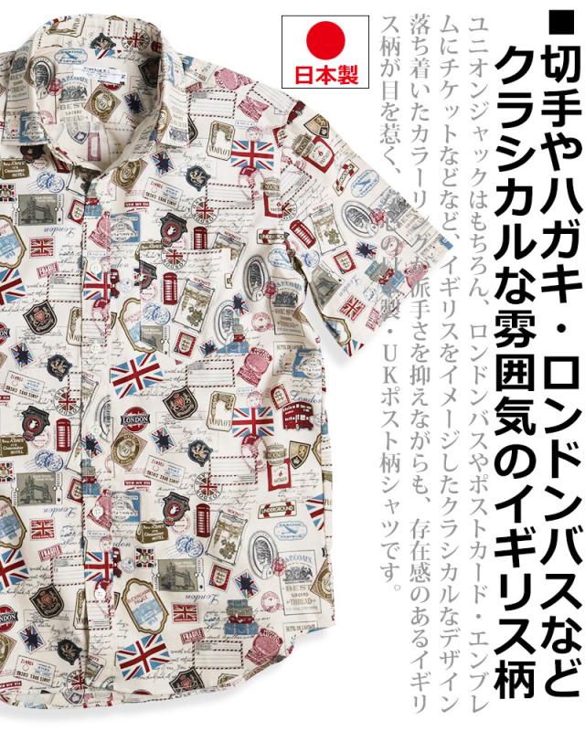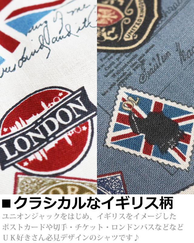 ポストカードやレター・エンブレムにロンドンバスなどイギリスをイメージした柄シャツ