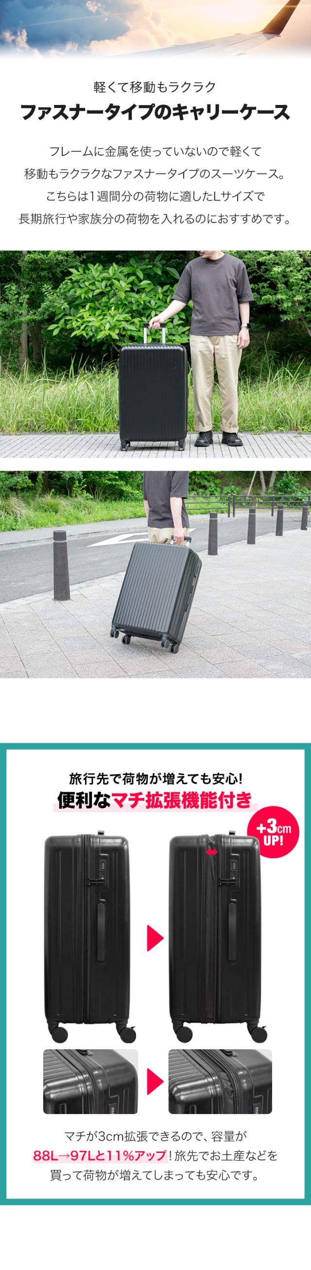 スーツケース Lサイズ 大容量 マチ拡張 88L〜97L 目安1週間〜 キャリーケース TSAロック ドリンクホルダー ストッパー付き ダブルキャスター 軽量 キャリーバッグ ダイヤルロック 頑丈 ポリカーボネート 海外旅行 出張 FIELDOOR 1年保証 送料無料