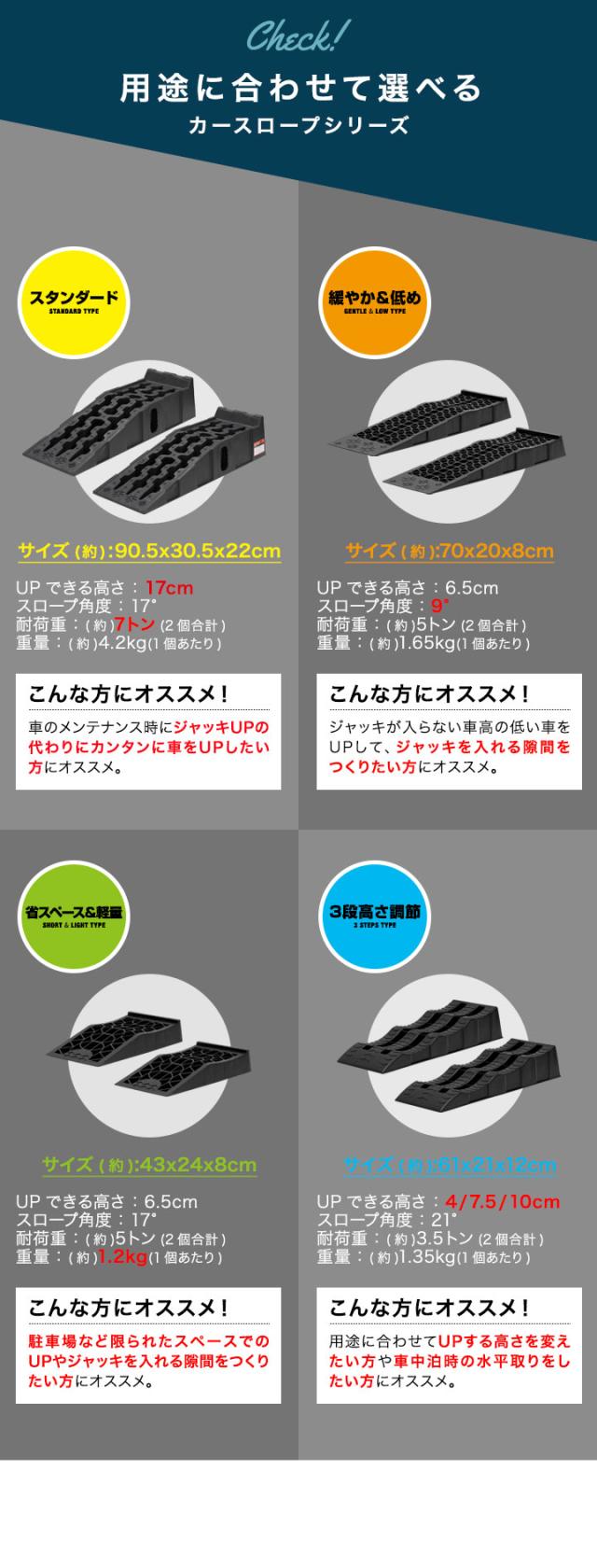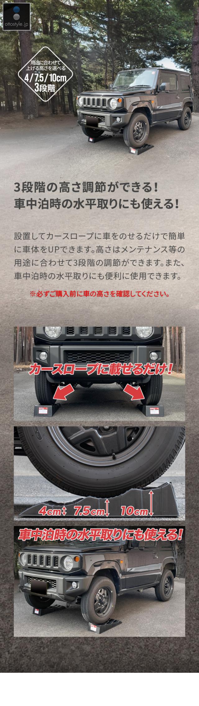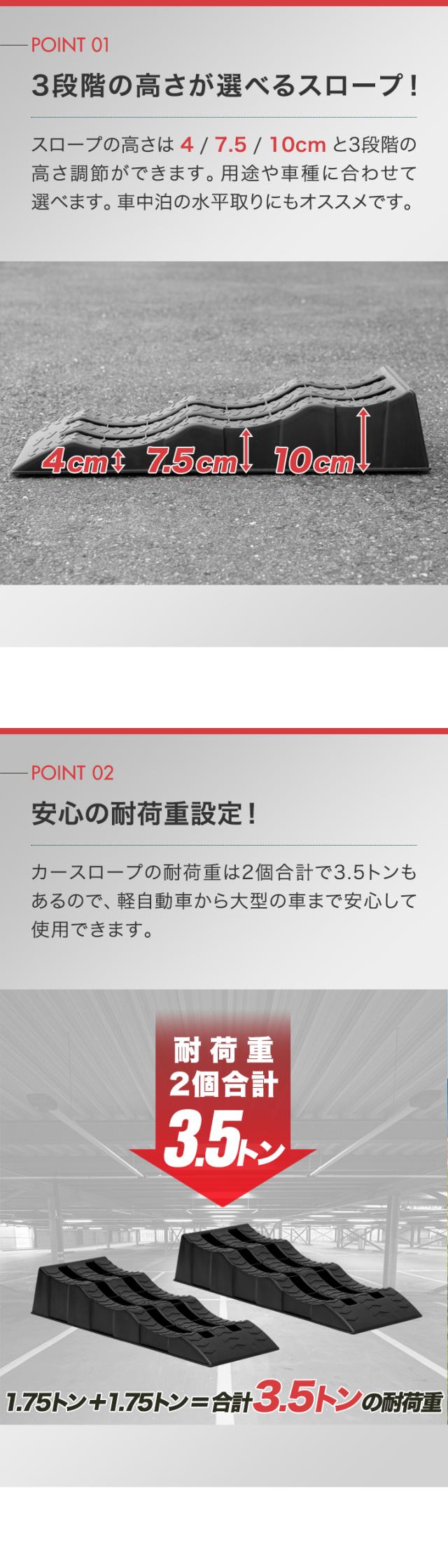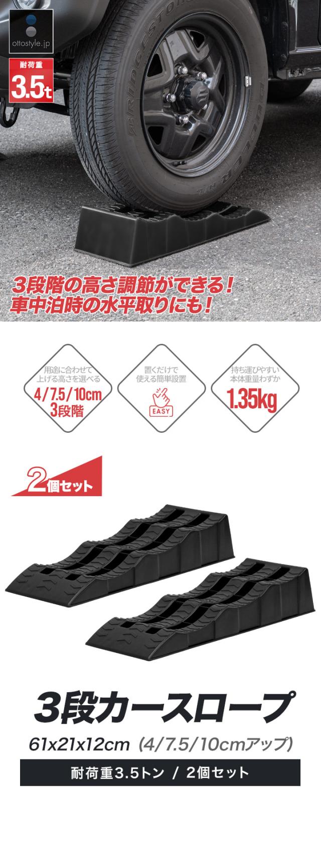 カースロープ カーランプ 自動車用スロープ 2本組 高さ3段階 4cm/7.5cm/10cm 耐荷重3.5トン 傾き解消 水平出し オイル交換 ジャッキ補助 ジャッキサポート 車両整備 整備用スロープ タイヤスロープ 軽自動車 ミニバン SUV 対応 1年保証 送料無料