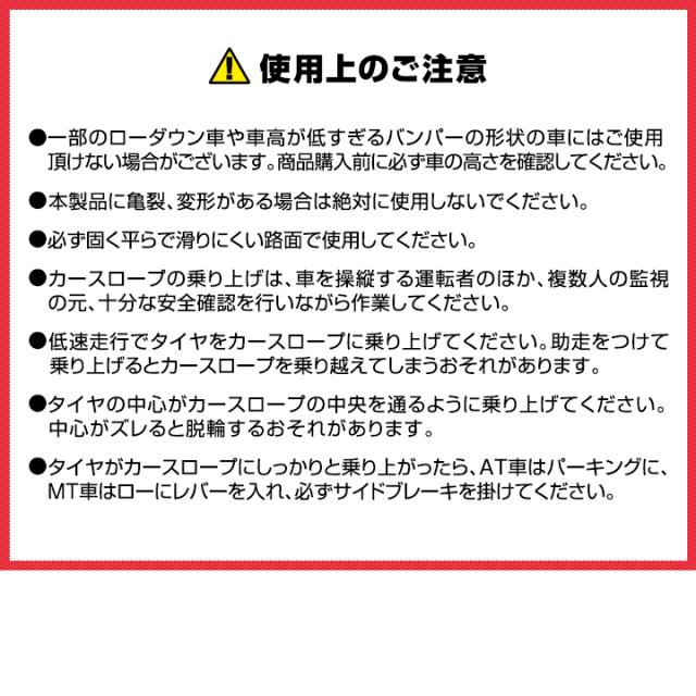 | 特記事項: ※本製品の耐荷重は3.5トン(2個合計)です。それ以上の荷重を掛けて使用しないでください。 ※一部のローダウン車や車高が低すぎるバンパーの形状の車にはご使用頂けない場合がございます。商品購入前に必ず車の高さ、形状を確認してください。 ※ご使用の際には注意事項をよくお読みのうえ、正しく安全に使用してください。 |