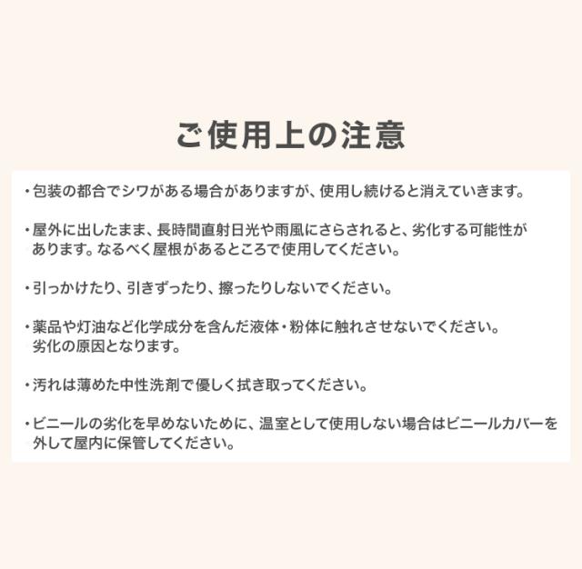 ・包装の都合でシワがある場合がありますが、使用し続けていただきますと消えていきますのでご安心ください。 ・屋外に出したまま長時間直射日光や雨風にさらされると劣化する可能性があります。なるべく屋根のあるところでご使用ください。 ・薬品や灯油など化学成分を含んだ液体・粉体に触れさせないでください。 ・汚れは薄めた中性洗剤で優しく拭き取ってください。 ・商品は、モニターによって色合いが異なって見える場合があります。 ・仕様・デザインは改良のため予告なく変更することがあります。 |