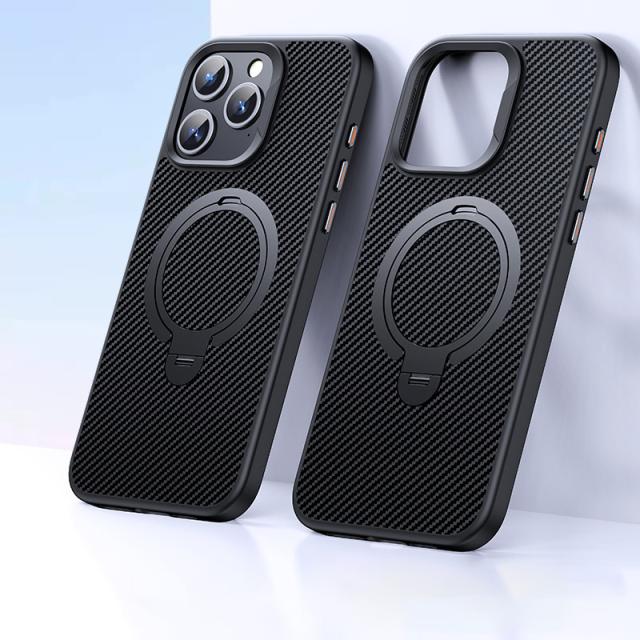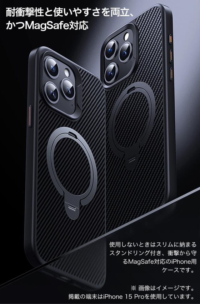 使用しないときはスリムに納まるスタンドリング付き、衝撃から守るMagSafe対応のiPhone用ケースです。