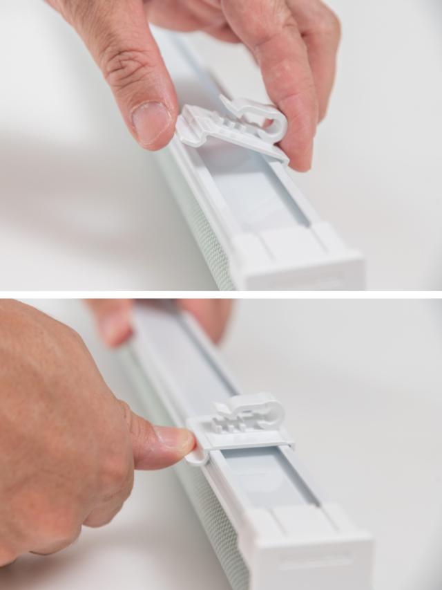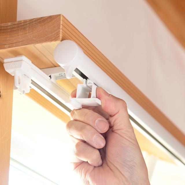ブラケットを指でつまんでカーテンレールの溝に押し込んで指を離してください。ブラケットを下に引いてみて外れないことを確認してください。