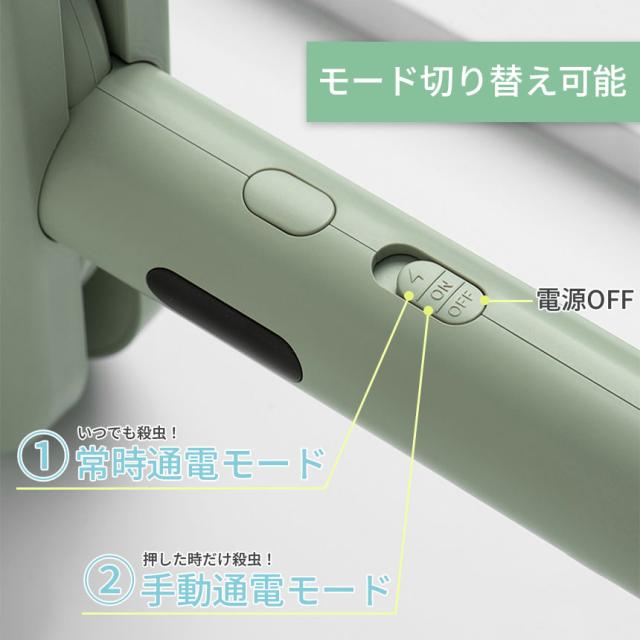 1のモードは金属ネットに常に電気が流れ、虫を引き寄せるUVライトも点灯するので、置き型として睡眠時の虫よけなどに適しています。