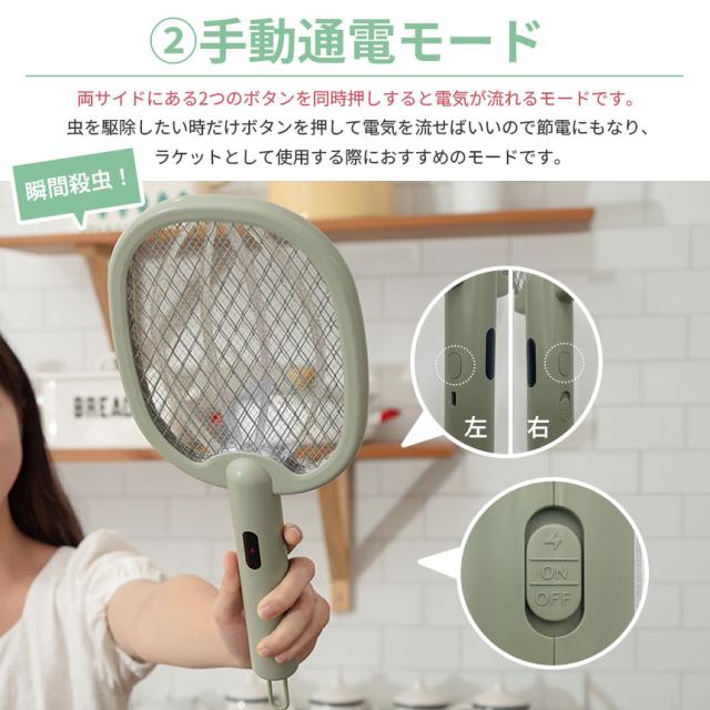 2のモードは両サイドにあるボタンを同時に押ている間だけ電気が流れるので節電にもなり、殺虫ラケットとして使用する際におすすめです。