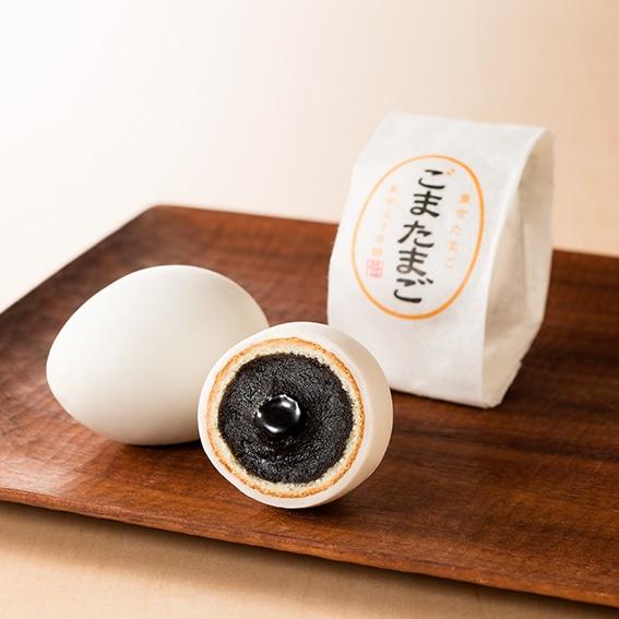 東京土産でおなじみの『東京たまご ごまたまご』は、黒ごまのペーストと黒ごま餡をカステラ生地で包んでホワイトチョコでコーティングした、かわいいたまご型のお菓子です。4層からなる絶妙なハーモニーがお楽しみいただけます。