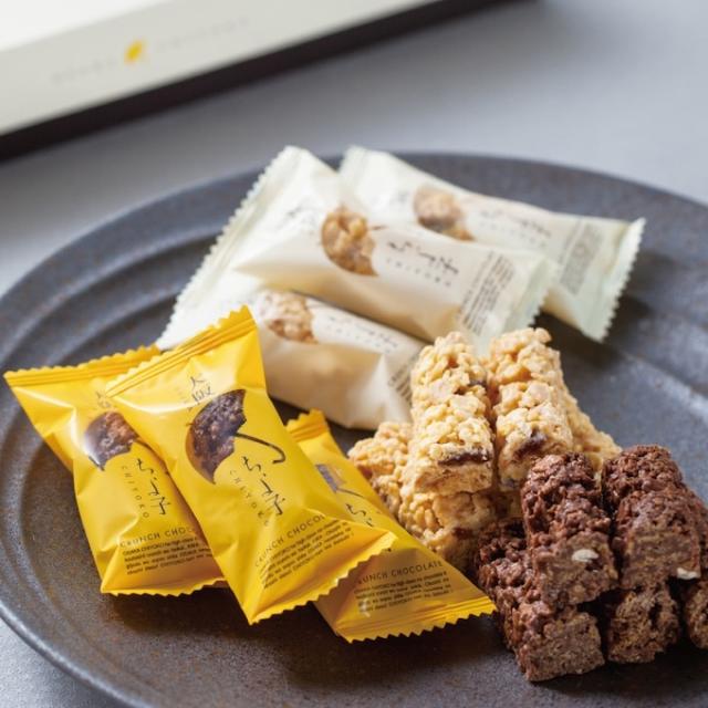 大阪ちよ子は、大阪名物粟おこしの製法を応用した、大阪ならではのチョコレートクランチです。サックリと軽やかな口当たりで、アーモンドチョコレートクランチとレーズンチョコレートクランチの2種類の味が楽しめます。14本入り(各種7本ずつ)