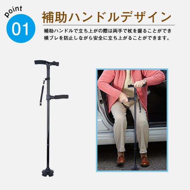 杖 自立式 折りたたみ杖 介護 4点杖 軽量 LEDライト付き ステッキ ギフト 包装箱付き 敬老の日 男性 女性 補助ハンドル付き 母の日 父の日