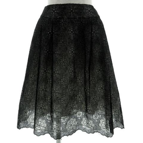 【中古】ルネ Rene スカート タック フレア ミディ丈 メッシュ花柄総レース 裾スカラップ 日本製 ブラック 黒 34