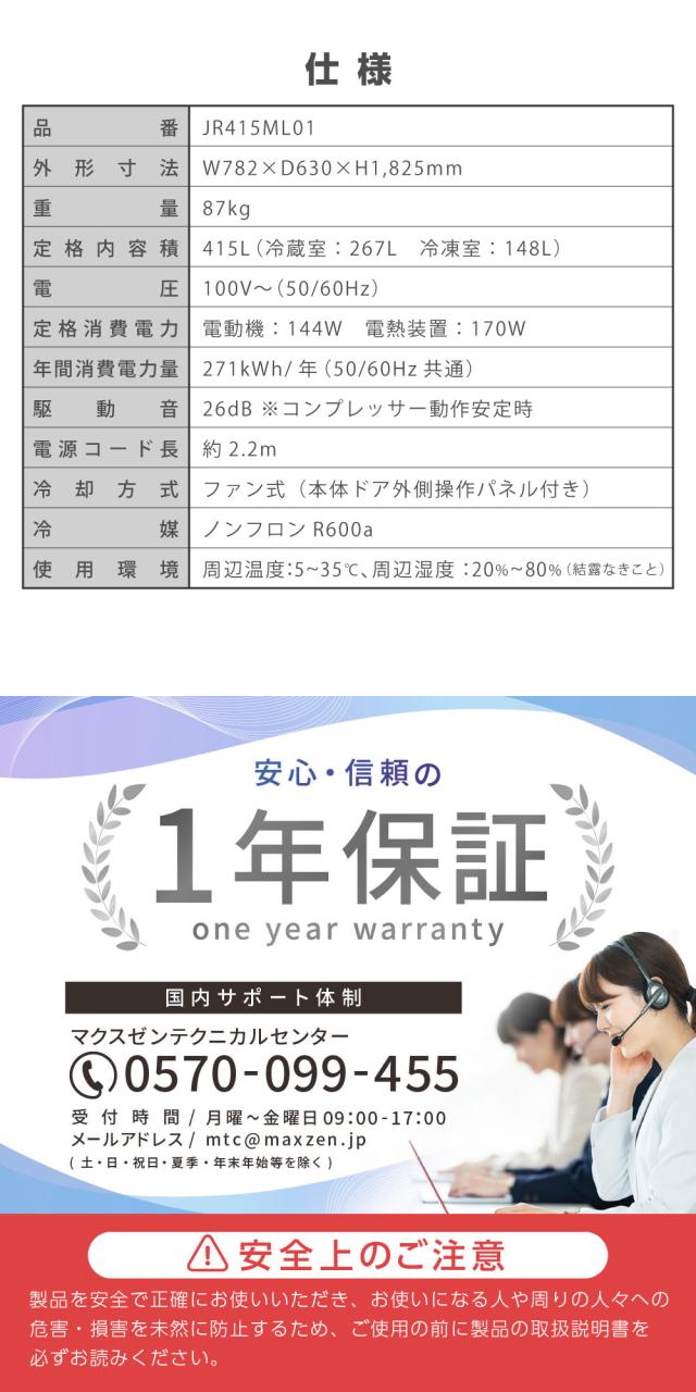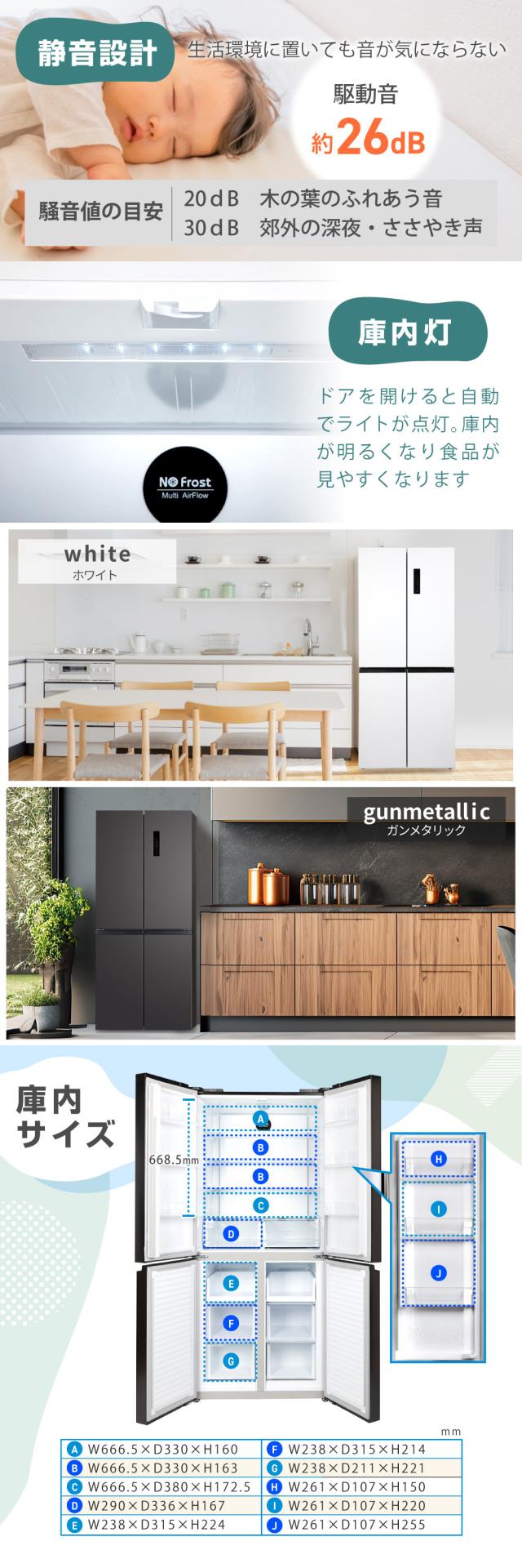 冷蔵庫 415L コンパクト 大容量 観音開き 4ドア 幅79cm 二人暮らし以上 霜取り不要 静音 チルド ドア閉め忘れアラーム 奥行薄型 黒 ガンメタリック JR415ML01 マクスゼン
