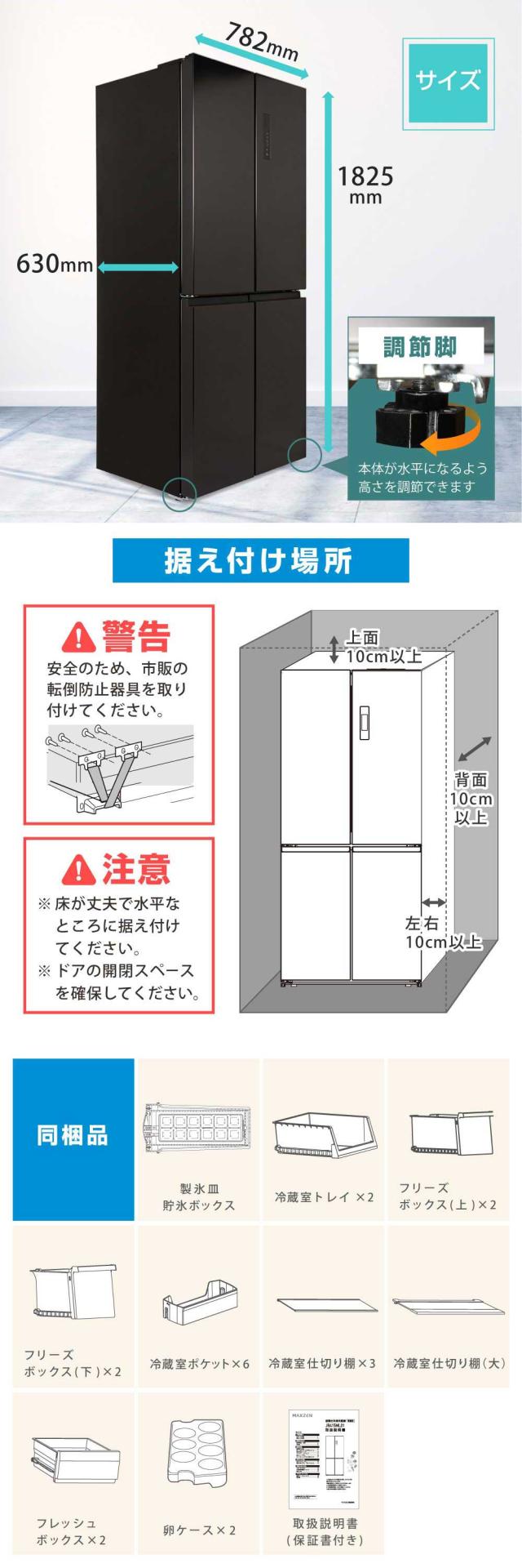 * 同梱品:製氷皿、貯氷ボックス、冷蔵室トレイ×2、フリーズボックス(上)×2、フリーズボックス(下)×2、冷蔵室ポケット×6、冷蔵室仕切り棚×3、冷蔵室仕切り棚(大)、フレッシュボックス×2、卵ケース×2、取扱説明書(保証書付き)