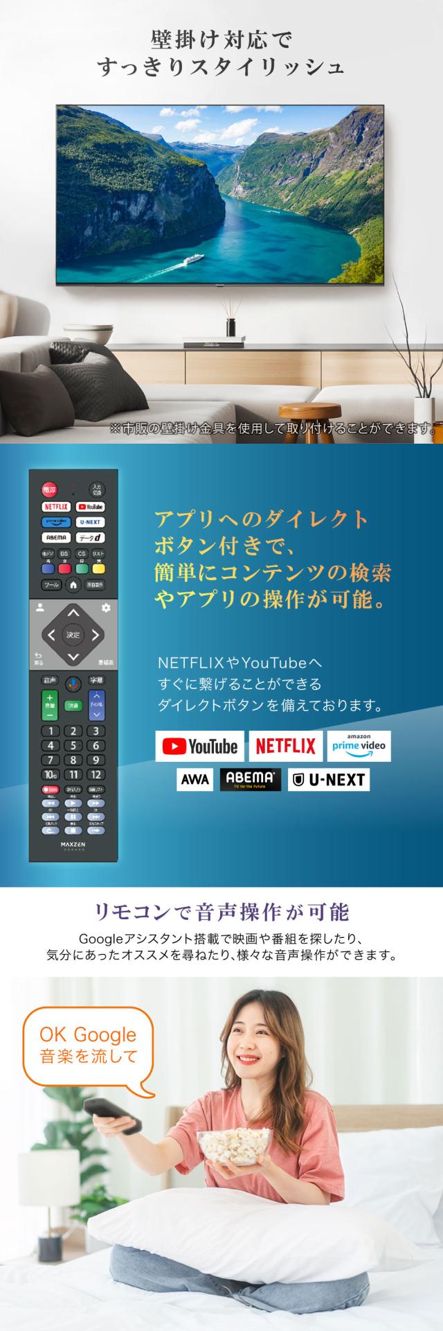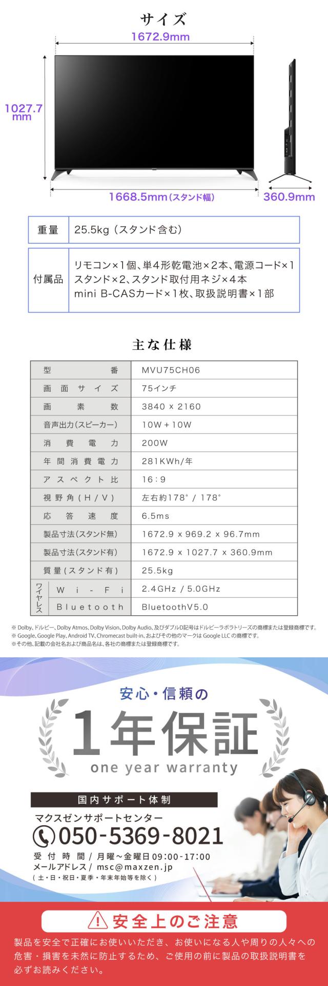 テレビ 75型 Googleテレビ 75インチ グーグルテレビ 75V Dolby Atmos Dolby Vision 4K対応 地上・BS・110度CSデジタル 外付けHDD録画機能 HDMI3系統 HDR Youtube Netflix Amazon Prime video ABEMA U-NEXT 視聴可能 MVU75CH06 マクスゼン