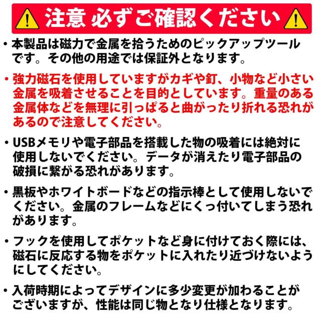 ・本製品は磁力で金属を拾うためのピックアップツールです。その他の用途では保証外となります。