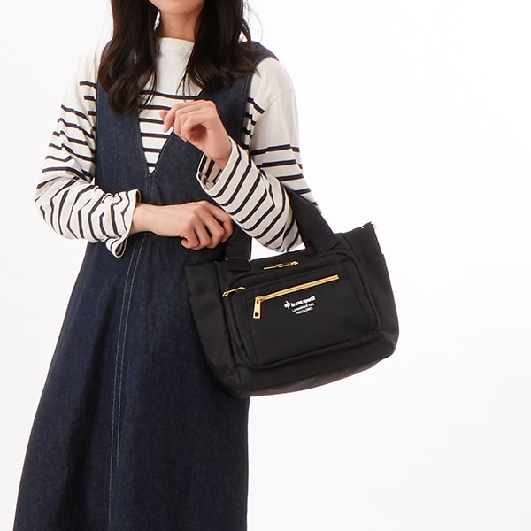 スポーツブランド<ルコックスポルティフ>の2WAYショルダーバッグです。脱着可能のショルダーベルトで手提げと斜め掛けで使用が出来ます。シンプルデザインでスポーティなカラーバリエーション。ポケットは全部で12ポケットと多収納。簡易お財布機能も付いているのでこれ一つでお出掛けができます。本体生地は撥水加工を施した生地を使用しているので突然の雨でも心強い。裏地には光触媒の織ネームを縫い込み。日光を充てることで効果を発揮します。