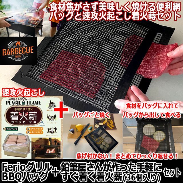 キャンプ アウトドア グリル網焼き (FerioグリルBBQバッグ鉛筆屋さんが作った手軽にすぐ着く着火薪36個セット)バーベキュー 夏休み 焦げ付かない くっつかない