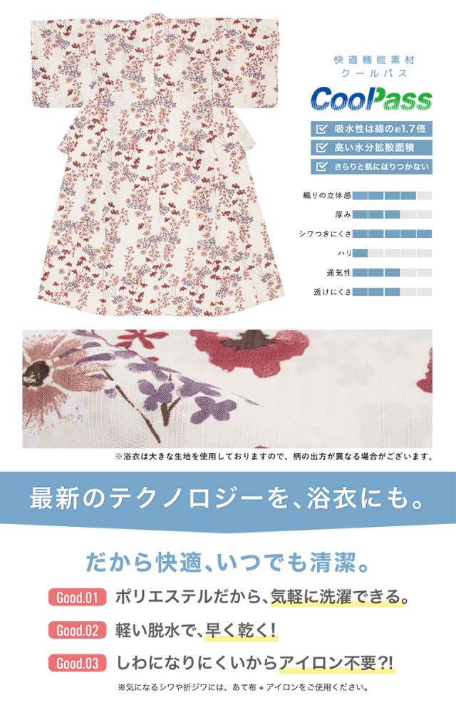 新作コーデ!内容は【浴衣・帯・下駄】のレディース浴衣3点セットです。浴衣生地は、ひんやりとした肌触りのポリエステル素材で、吸汗性と速乾性の繊維のCoolPassを使用しています。帯はポリエステル100%です。仕立て上がりですので、お届け後すぐにお召しいただけます。