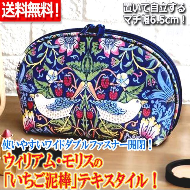 ウィリアム・モリスのいちご泥棒 ガバッと開く化粧ポーチ (ワイド開閉 ダブルファスナー セレブ 優雅 エレガント 小物入れ)