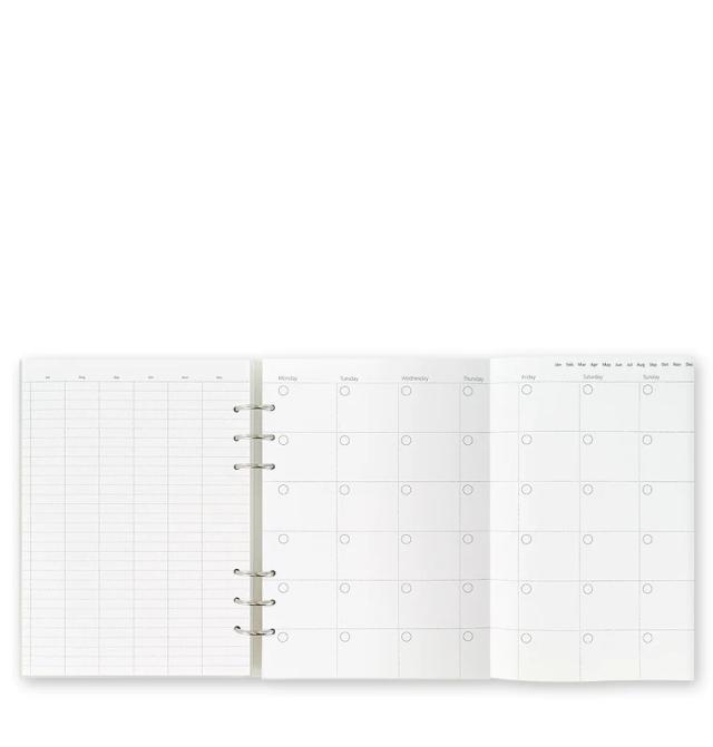 表紙、罫線用紙15枚、方眼用紙15枚、無地用紙15枚、折り畳み式日付なし年間予定表(両面)1枚、折り畳み式日付なし月間予定表(両面)6枚、日付なし見開き1週間ダイアリー13枚、タスク/To Do 5枚