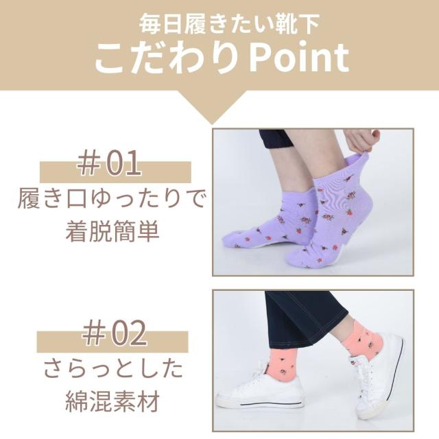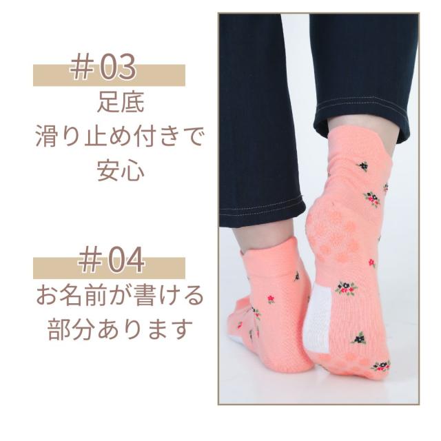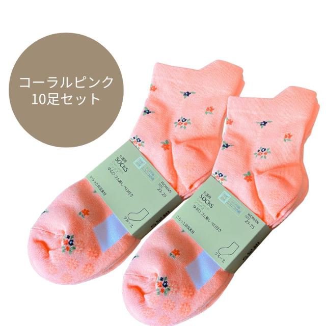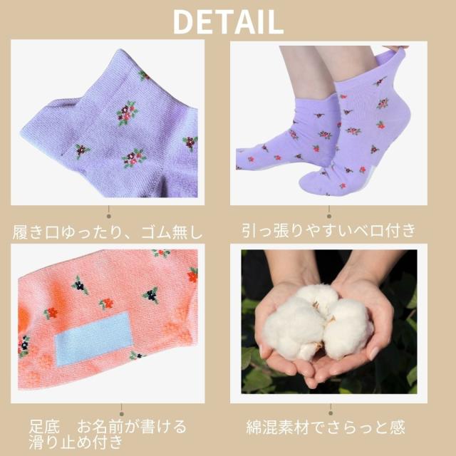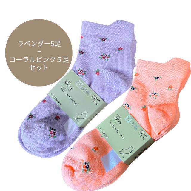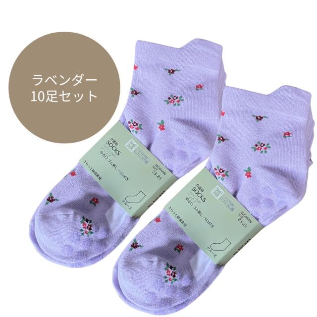 【カラー】 ラベンダー/コーラルピンク【サイズ】 23-25cm/25-27cm【素材】 ポリエステル 綿 ポリウレタン 柄 小花柄【洗濯表示】 家庭洗濯【シーズン】 オールシーズン【商品説明】名前が書ける靴下 締め付け解消 すべり止め付き ゴムなし ベロ付 介護用 介護施設で人気商品です。小花柄でかわいい10足セット特徴 足底に名前が書けて便利です!綿混素材でさらっとしており、家庭洗濯できます履き口ゆったりしていて、ゴム無しで締め付け解消!すべり止め付きで安全!【注意事項】 肌に合わない場合は、着用をおやめくだざい。