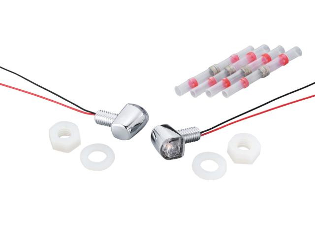 【製品特徴】 ●ECE認証(50R)を取得済みで車検対応可能 ※取り付ける場所によっては法規を満たさないことがあります。 ●ボディーサイズ:9.8×9.8×14.2mm ●ネジ径×長さ:6×10mm ●本体:アルミダイキャスト製 ●カラー:クロームメッキボディ/クリアレンズ ●発光:シングル/アンバー ●12V1.5W ●2個入り