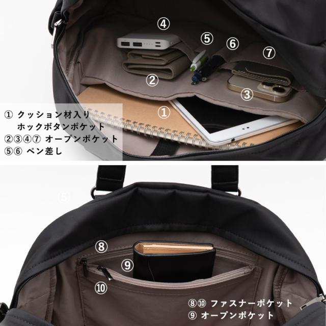 ●内ポケット:クッション材入りホックボタン付きポケット1、オープンポケット5、ペン差し2、ファスナー付きポケット2