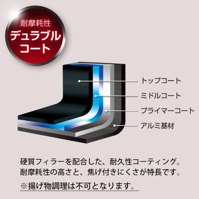 硬質フィラーを配合した耐摩耗性デュラブルコートで耐久性が高く、焦げつきにくいのが特長です。