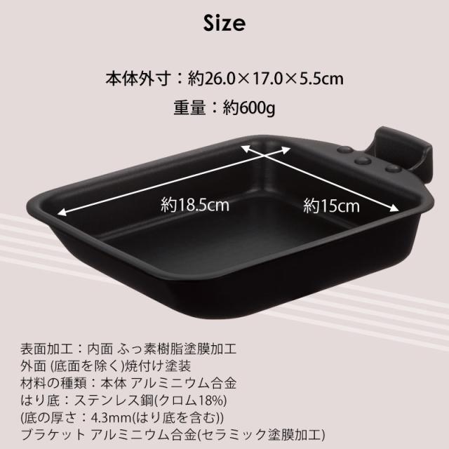| 商品説明 | デュラブルシリーズ 取っ手のとれる玉子焼きフライパンです。 硬質フィラーを配合した耐摩耗性デュラブルコートで耐久性が高く、焦げつきにくいのが特長です。 幅広なので玉子焼き以外の炒め物にも便利。 取っ手を外せばオーブン(上限温度220度)にも使えます。 (揚げ物調理は不可となります。) 内側がフラットで玉子焼きがきれいに作れます。 「焼く、茹でる、炒める」といろいろ使えます。 大きなフライパンを使わず、お弁当のおかずをコンパクトなこちらのフライパンで作ることができますね! ご覧の商品には取っ手は付属しておりません。 別売の取っ手を合わせてご購入ください。 また玉子焼きフライパンと取っ手のセットページもございます。 |
