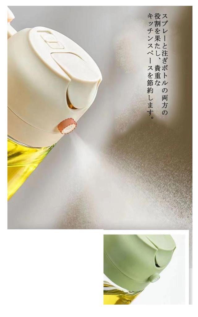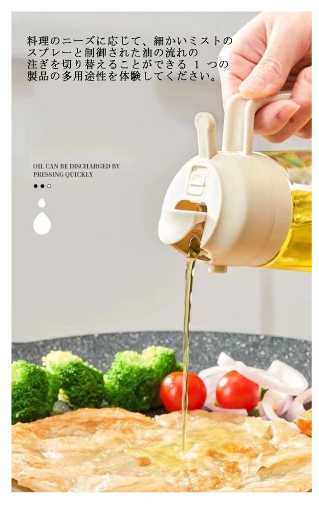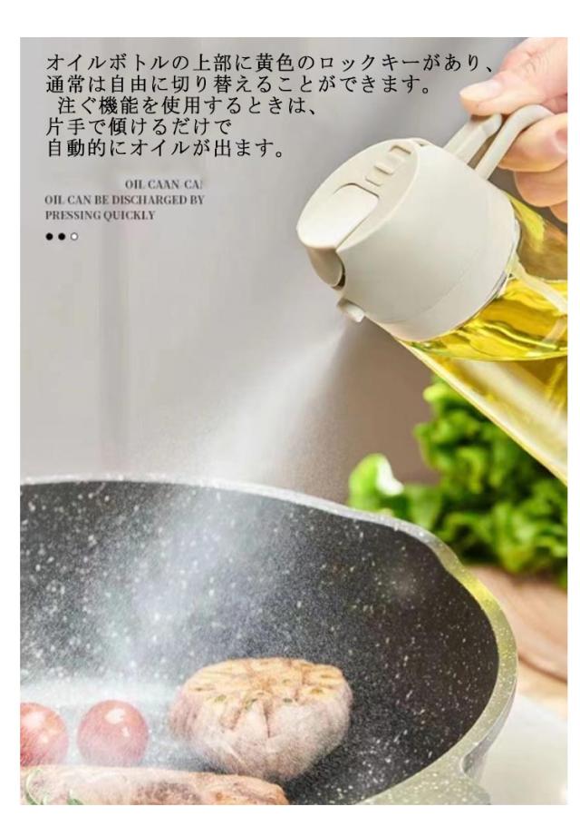 | シンプルでスタイリッシュな2-in-1オイルディスペンサーです。 スプレーと注ぎボトルの両方の役割を果たし、貴重なキッチンスペースを節約します。 オイルボトルの上部に黄色のロックキーがあり、通常は自由に切り替えることができます。 注ぐ機能を使用するときは、片手で傾けるだけで自動的にオイルが出ます。 本体はガラス製のため中身が見やすく補充時期が分かりやすいです。 ニオイ移りもしにくいので食品の保管に最適です。フタ付きなので虫やホコリが入るのを防ぎ、衛生的です。 じょうごを使わずにオイルを入れることができ、キッチンを汚す心配もありません、もっと簡単で便利です! 料理のニーズに応じて、細かいミストのスプレーと制御された油の流れの注ぎを切り替えることができる 1 つの製品の多用途性を体験してください。 | |