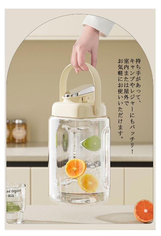 | 2.2L&3.5Lのたっぷり入る大容量、大人数のご家庭やパーティーにも最適! 冷水筒は独特の蛇口デザインを採用しており、軽く押すだけで涼しい飲料水を得ることができます。 氷をたっぷり入れて、夏には麦茶を楽しめます。酷暑には、いつでも涼しい水が飲めます。 360度密封されているから、屋外でも漏れずに持ち出しOK! PP材質のため、万一倒しても安全。お子様も怪我の心配等なく、ご使用頂けます。 持ち手があって、キャンプやレジャーにもバッチリ!室内または屋外でお気軽にお使いいただけます。 | |