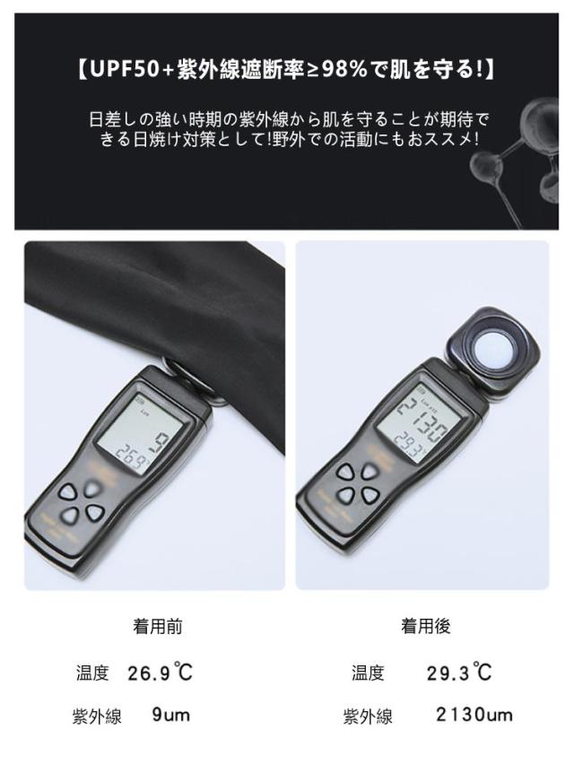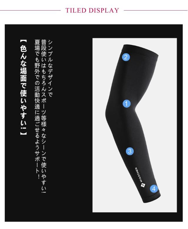 | UVカット率?98% 接触冷感 UPF50+ 暑い日のスポーツシーンに最適なメンズアームカバー 【触った瞬間ひんやり】接触冷感の材質を採用して、汗をかいたり水に触れたりした時、氷水と洋の満れが熱の作用を気化させ、気化吸熱原理に基づいて。冷却効果があります。 【UPF50+紫外線遮断率?98%で肌を守る!】日差しの強い時期の紫外線から肌を守ることが期待できる日焼け対策として!野外での活動にもおススメ! 【ズレ落ち防止】引き締めるデザイン、手や肘の曲げ伸ばしによるずリ上がりやずり落ちりの心配がなし! 【伸縮性・通気性抜群】伸縮性にも優れ多様な腕にもフィット◎ さらに通気性も抜群で速乾性も抜群なので快適に着用できます! 【毛玉になりにくい】高品質なアイスシルク生地を使用することで引っかかりによる毛玉を防止します。 【色んな場面で使いやすい!】シンプルなデザインで普段使いはもちろんスポーツ等様々なシーンで使いやすい!夏場でも野外での活動快適に過ごせるようサポート! | |