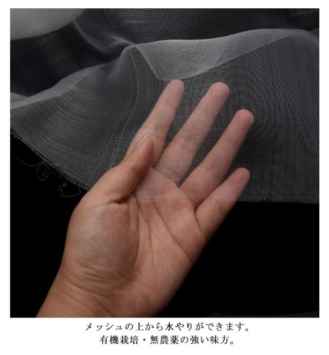 | 約2m×約6m 透光率約90%で太陽のめぐみいっぱい。 1ミリメッシュで、コナガ・アブラムシ・カメムシ・バッタ・蝶・青虫・ウリハムシ等を侵入防止。 メッシュの上から水やりができます。 有機栽培・無農薬の強い味方。 | |
