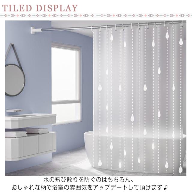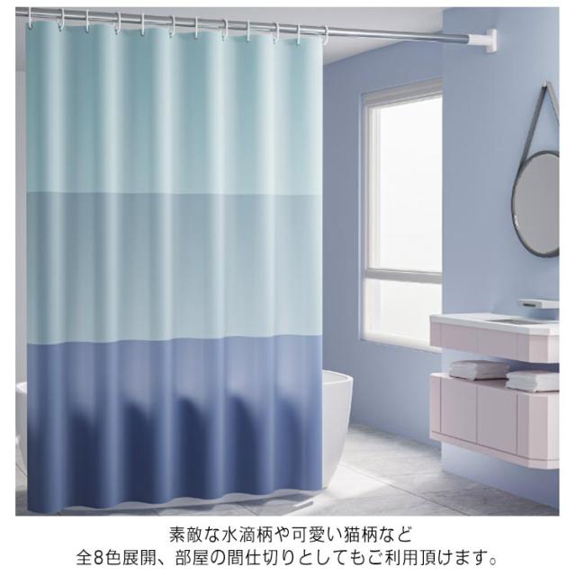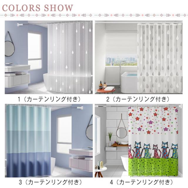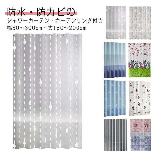 | 防水・防カビのシャワーカーテン・カーテンリング付き 幅80〜300cm・丈180〜200cm 水の飛び散りを防ぐのはもちろん、おしゃれな柄で浴室の雰囲気をアップデートして頂けます♪ カーテンリング付属しているので、カーテンポールに引っ掛けるだけで取付できます。(カーテンポールは付属しません。) 素敵な水滴柄や可愛い猫柄など全8色展開、部屋の間仕切りとしてもご利用頂けます。 ちょっとした目かくしや、暖房、冷房の効率アップにも。 | |