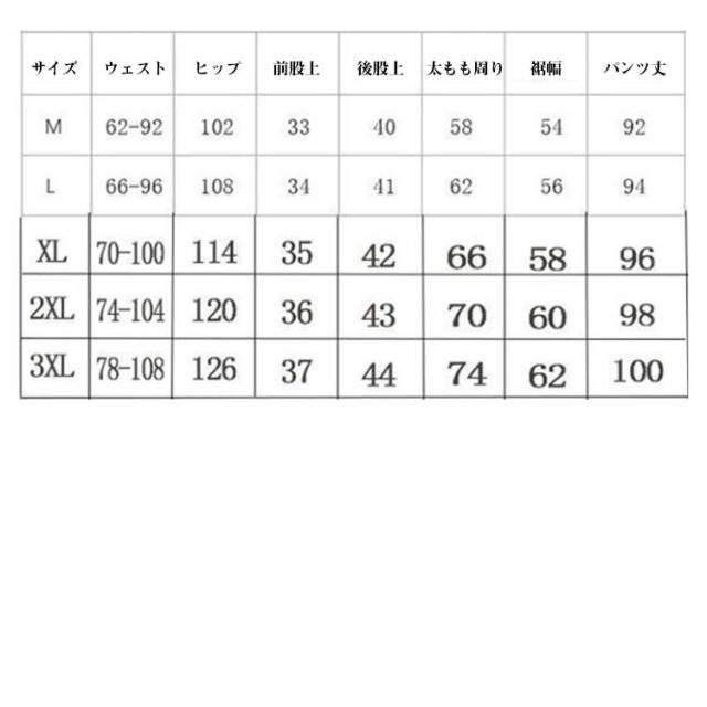 | サイズについての説明 | M:ウエスト62-92/ヒップ102/股上33/ワタリ幅58/着丈92(CM) L:ウエスト66-96/ヒップ108/股上34/ワタリ幅62/着丈94(CM) XL:ウエスト70-100/ヒップ114/股上35/ワタリ幅66/着丈96(CM) 2XL:ウエスト74-104/ヒップ120/股上36/ワタリ幅70/着丈98(CM) 3XL:ウエスト78-108/ヒップ126/股上37/ワタリ幅74/着丈100(CM) |