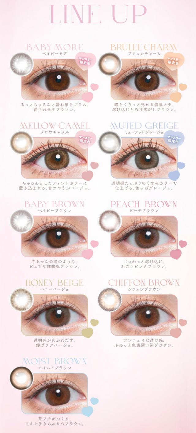 ■カラー:ベイビーブラウン、ハニーベージュ、ピーチブラウン、シフォンブラウン、モイストブラウン、メロウキャメル、ミューテッドグレージュ、ベイビーモア、ブリュレチャーム