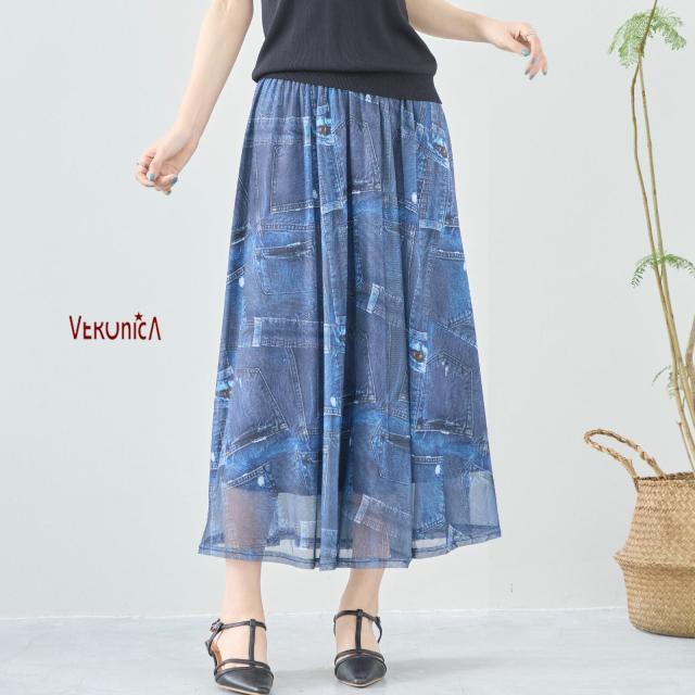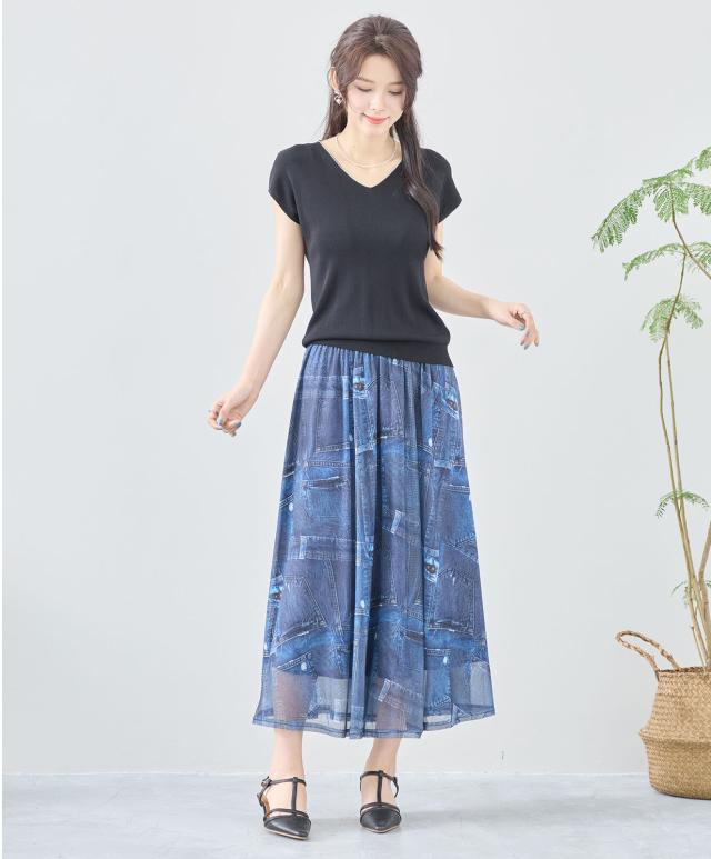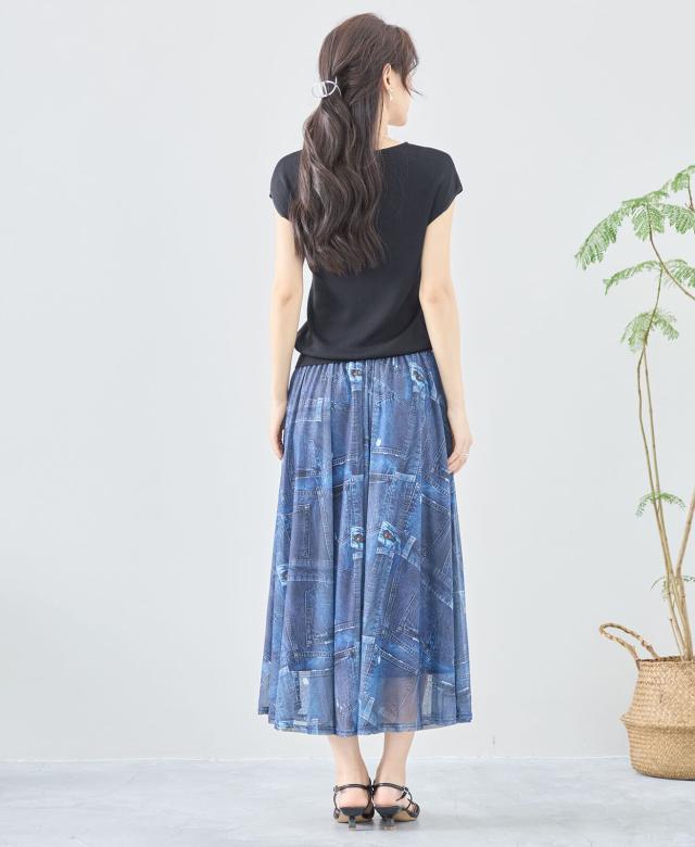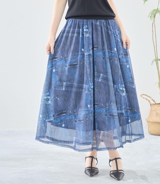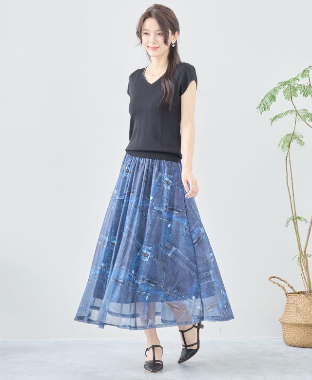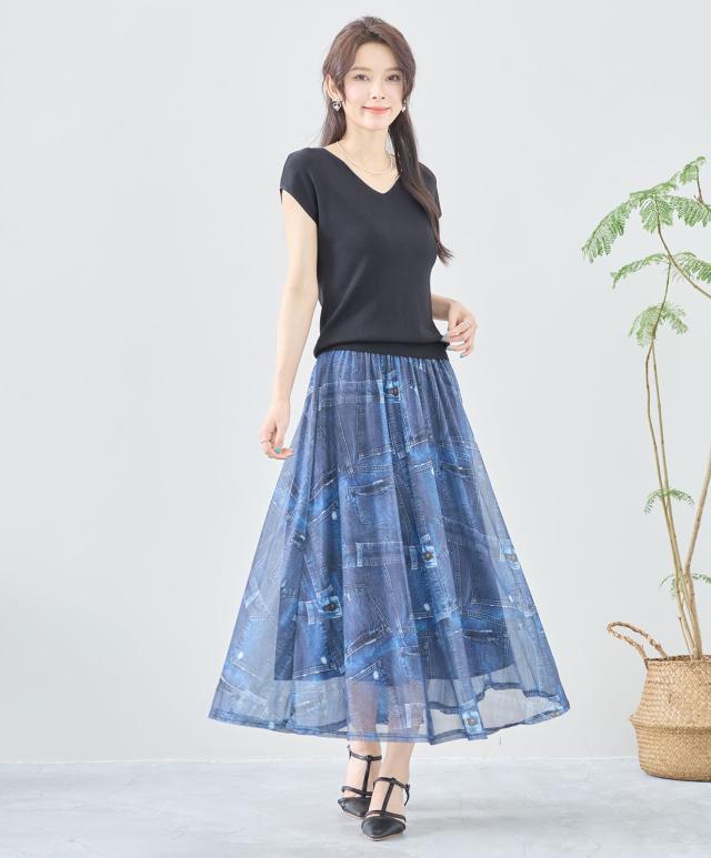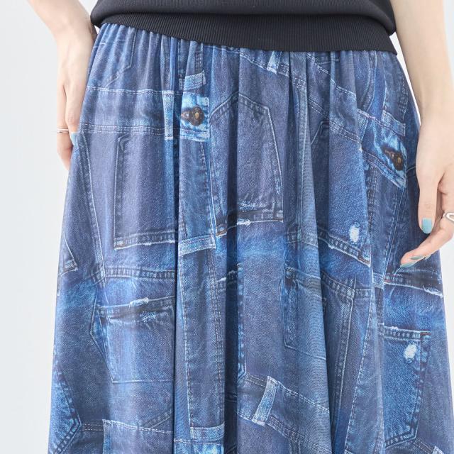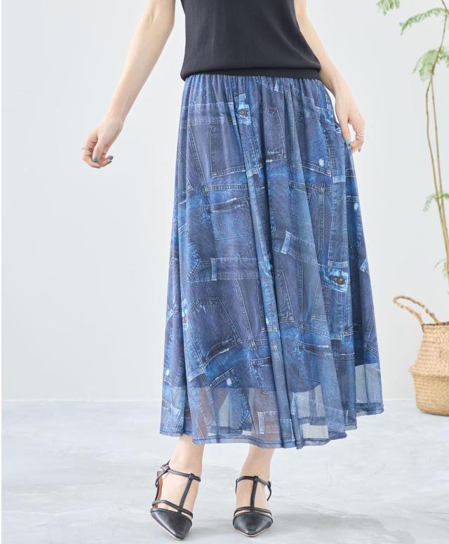 【即納】デニム柄プリントシアーロングスカート フレアスカート ボトムス ウエストゴム 春夏 新作