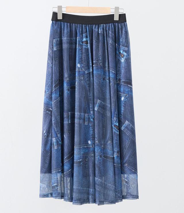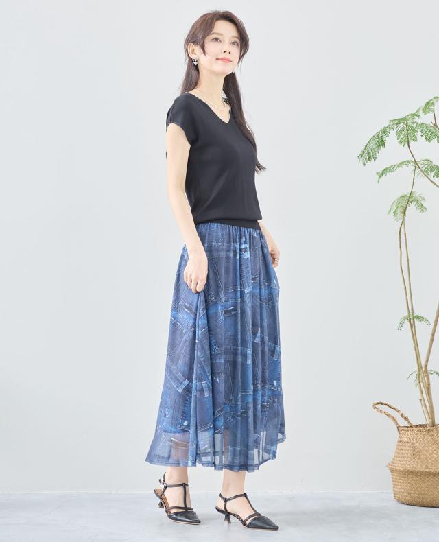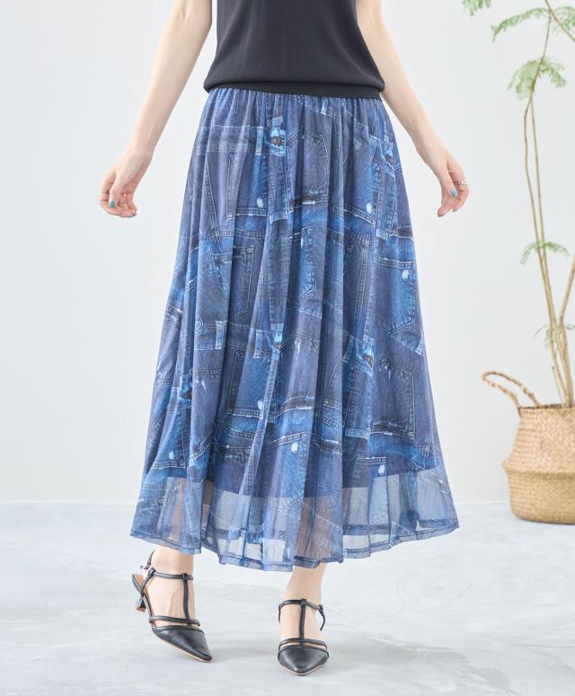 エアリー感たっぷりなシアーロングスカート。透け感がとってもセクシーで美脚効果も抜群です。デニムのプリントでカジュアル感もプラス。シンプルなトップスと合わせて綺麗めな大人スタイルのコーディネートが完成します。