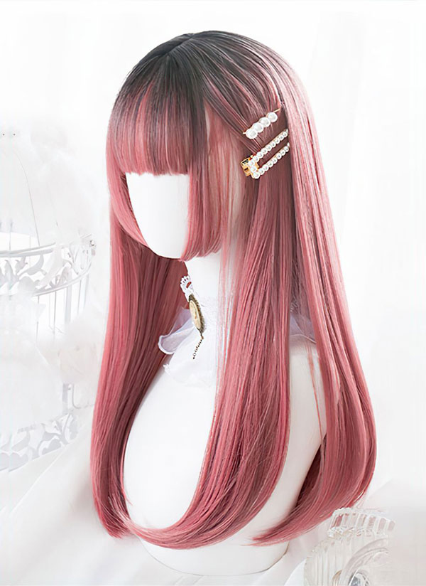 このフルウィッグは、姫カットのスタイルで、ブラックからレッドへのグラデーションが施されたロングストレートデザインです。