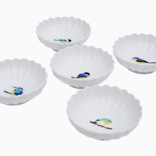 日本製 九谷焼/久谷五彩 磁気/陶器/陶磁器 小皿/皿/お皿 鳥/野鳥 ちゅんちゅんこづけ セット売り/5点セット 可愛い 華やか/鮮やか お洒落/オシャレ お祝い/記念日/誕生日/結婚祝い/開店祝い プレゼント/贈り物/ギフト 食器/和食器 インテリア