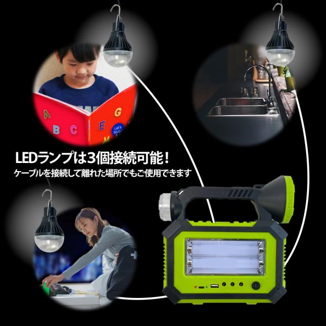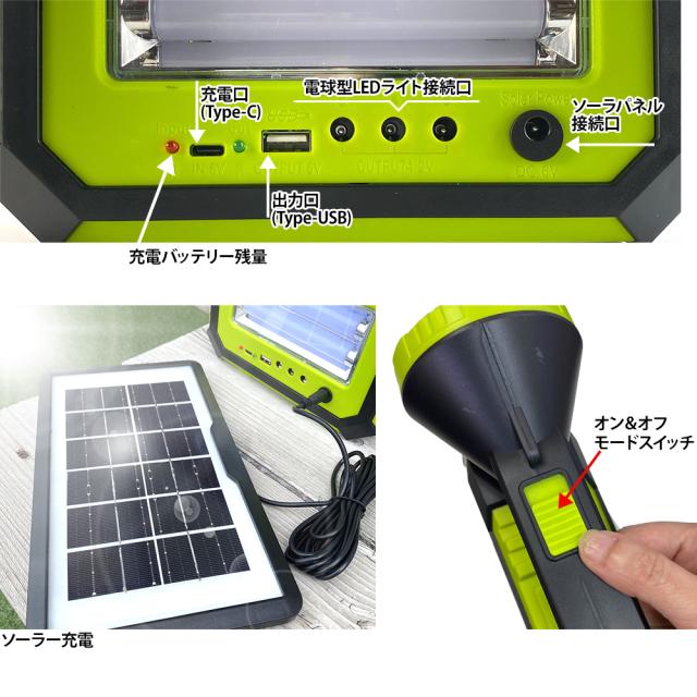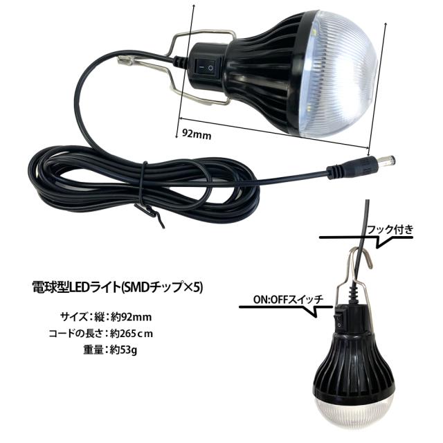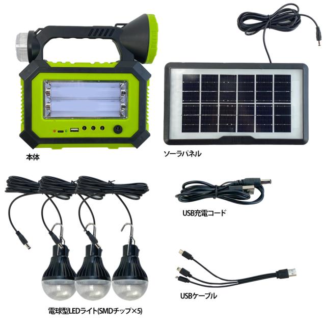 【セット内容】本体、ソーラーパネル、電球型LEDライト(SMDチップ×5)、USB充電コード、USBケーブル