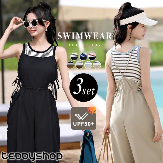 春新作 水着 レディース 体型カバー ビキニ サロペット 3点セット タンキニ オールインワン アメスリ パッド付き ボーダー リボン ラッシュガード素材 UPF50+ 急速冷感 接触冷感 バッククロス 露出控えめ おしゃれ ドロスト お腹 ウエスト