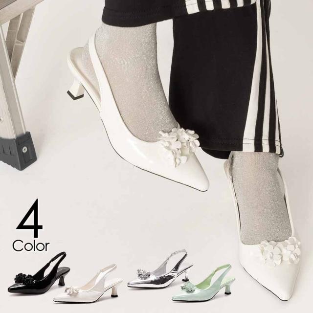 スリングバック キトゥンヒール フラワーモチーフ ポインテッドトゥ パンプス。