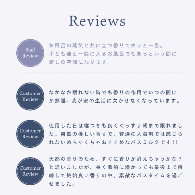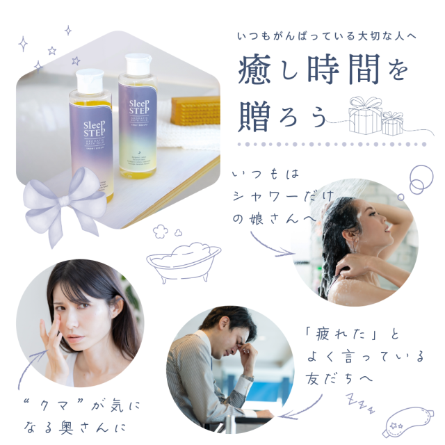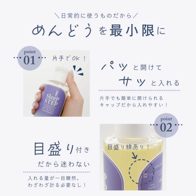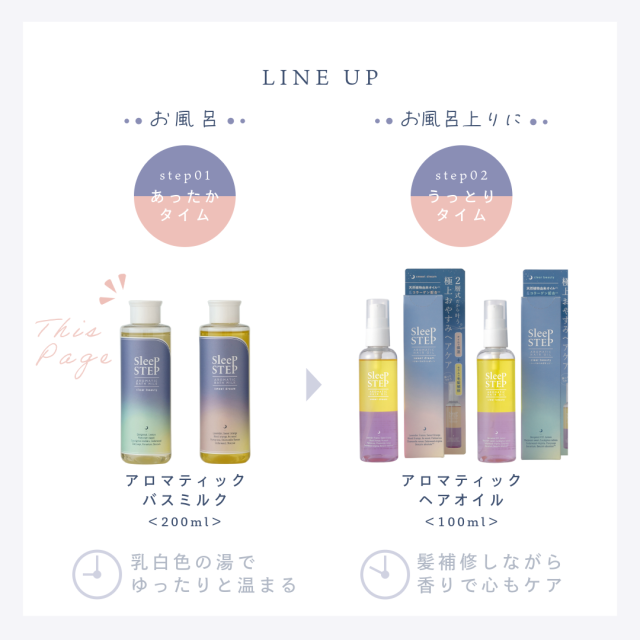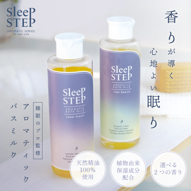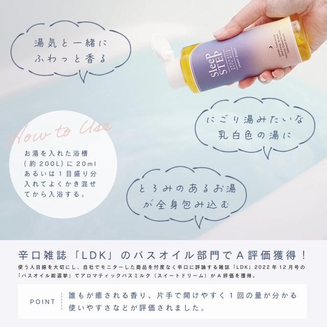 ご褒美バスタイム 睡眠のプロが監修した アロマティックバスミルク ・天然精油100% ・植物由来の保湿成分 ・選べる2つのアロマの香り 香りで癒やす贅沢なバスタイム じんわり温まり、 香りで心も身体も とろける贅沢時間 (1)スイートドリーム └フリーラル ラベンダー の香り (2)クリアビューティー └ハーバル ベルガモット の香り 毎日ぐっすりと眠れていますか? 多くの人が睡眠に悩みを抱える「不眠大国」日本。 仕事や子育てに頑張る女性は特に睡眠時間が少ない傾向に。 ・メーカー調べ 睡眠に悩みを感じている人82% 「睡眠の悩み」をなんとかしたい!と「眠りとお風呂の専門家」 小林 麻利子さんとタッグを組んで生まれたのがSleepSTEPです。 睡眠のプロが監修 世界で最も睡眠時間が短く、質も悪い日本人。 普段の生活に「ちょっと加えるだけ」で 睡眠をサポートするものが必要と感じていました。 香りを纏うだけで、一瞬で「眠り」に心が切り替わり、 ちょっとずつ素の私に戻る。 毎日の夜に、あなたの心に寄り添う香りであってほしい、 と願っています ・睡眠改善インストラクター 小林 麻利子 香りで、こころも、からだも、完全オフモード 好きな香りで満たされたお湯につかると、 肩の力がふっと抜けて、心も身体もゆるみます。 一日中オンになっていたスイッチを切って素の自分に戻ろう。 小林さんからの一言 質の良い睡眠は、質の良い入浴から。 ゆっくりといつもの自分にかえり、 心も身体も整えて。 - How to Use - お湯を入れた浴槽(約200L)に20mL あるいは1目盛り分入れて よくかき混ぜてから入浴。 ・湯気と一緒にふわっと香る ・にごり湯みたいな乳白色の湯に ・とろみのあるお湯が全身包み込む 雑誌「LDK」でA評価獲得! 使う人目線を大切にし、自社でモニターした商品を 忖度なく辛口に評価する雑誌「LDK」 2022年12月号の「バスオイル総選挙」で アロマティックバスミルク(スイートドリーム)が A評価を獲得! ◯評価Point ・誰もが癒やされる香り ・片手で開けやすい ・1回の量がわかる使いやすさ 眠りに導く癒やしの香り 一日がんばった心とからだを落ち着かせてくれる 「酢酸リリナル」や「リナロール」など、 香り成分バランスも重視し、アロマセラピストが厳選。 天然100%×8種の天然精油で調合した2つの香り ◯クリアビューティー ハーバル ベルガモット の香り 思わず深呼吸したくなるような スッキリとして落ち着いた香り。 呼吸する度心満たされリラックス。 ◯スイートドリーム フローラル ラベンダー の香り ゆったりとした時間を過ごせそうな 甘くうっとりとした香り。 良い夢が見れそうな香りに包まれる。 肌に直接使うものだから安心とこだわりを ◯植物由来の保湿成分配合 ・米糠(ぬか)油 ・オリーブ油 ・ホホバ油 肌しっとり潤ってスベスベを実感。 植物由来の成分だから安心して入浴できます。 ◯余分なものは入れない5つの無添加 ×パラベン ×鉱物油 ×石油系界面活性剤 ×合成香料 ×合成着色料 ◯安心の Made In Japan 肌に直接使うものだからこそ、 安心の日本製。 \日常的に使うものだから/ めんどうを最小限に Point.01 パッと開けて、さっと入れる 片手で開けられるキャップだから入れやすい! Point.02 目盛り付きだから迷わない ボトルに目盛線があるので、 入れる量が一目瞭然でわざわざ測る必要なし! 好きな香りに満たされて最高の御疲れ様を 毎日いろんなことがあるけれど、 終わりよければすべてよし。 寝る前のヘアケアタイムで、 呼吸するたびに好きな香りに満たされる時間。 心と身体を癒やすことで、 心地よい音ぶりへの時間をサポートします。 元気なおはようのために香りで「心地よい眠り」 一日がんばったからだをいたわる香りと過ごす ”質のいい睡眠”にはそんな時間がとても大切。 ぐっすり眠ることができれば、 きっと明日は元気に「おはよう」が言えるはず。 |