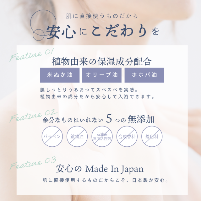 ●植物由来の保湿成分配合:米ぬか油、オリーブ油、ホホバ油
