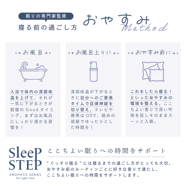 独自の睡眠メソッドを採用したSLEEP STEPシリーズは、入浴から睡眠までの時間をトータルでサポートします。