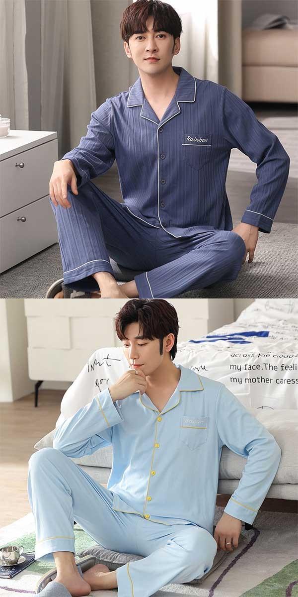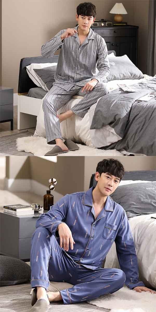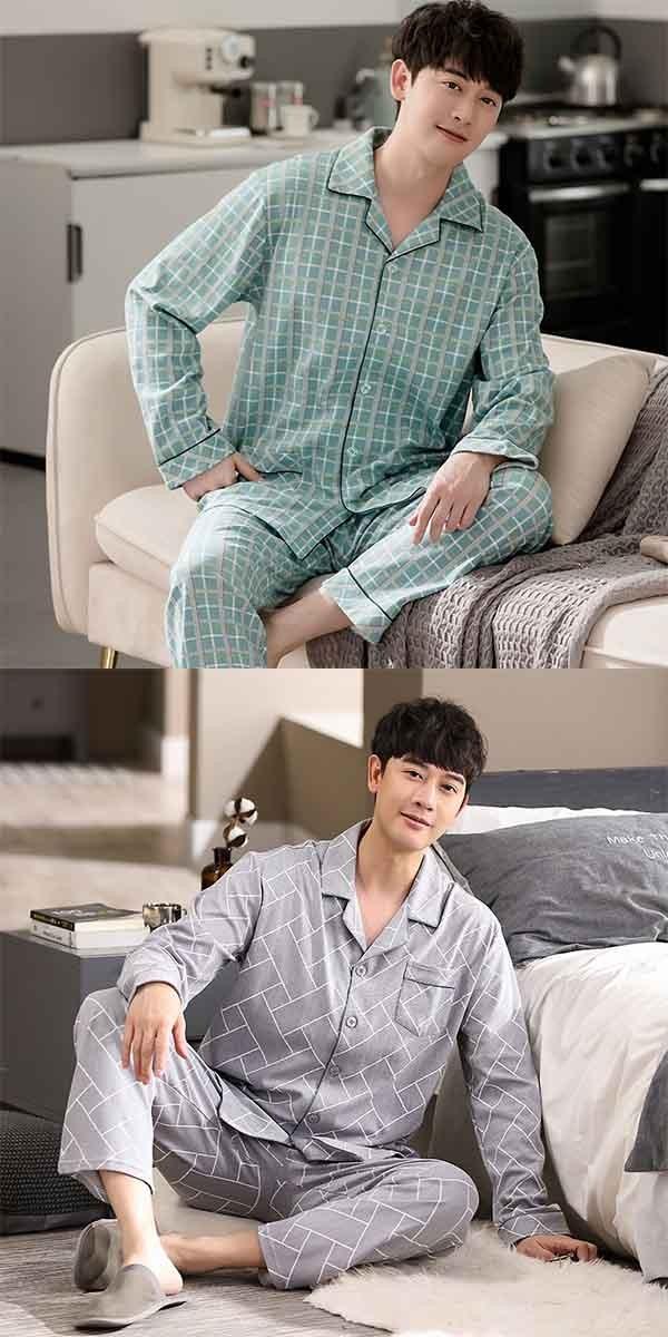 パジャマ 夏用 メンズ ルームウェア 部屋着 男性用 長袖シャツ 長ズボン 着心地抜群 涼しい 爽やか メンズパジャマ 上下セット セットアップ おうち時間 寝間着 父の日 ギフト プレゼント 紺色 紺 ブルー グレー 春 秋 dh063n1n1c0