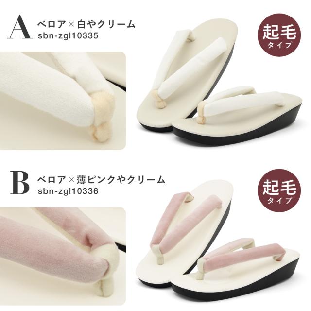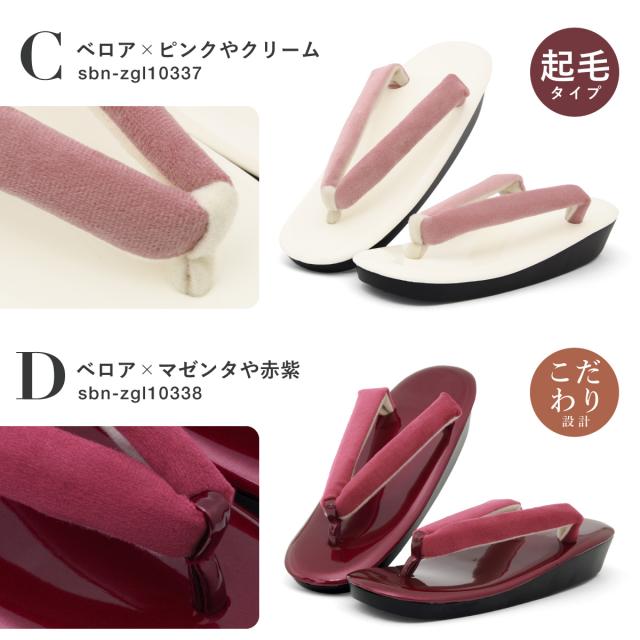つややかなエナメルの天と同じくエナメルの鼻緒や、べロア生地のふっくらとした太鼻緒は、シンプルでお着物に合わせやすい無地です。