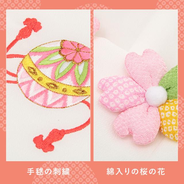 シボのあるちりめん生地に、ワンポイントで手毬の刺繍が施され、綿入れの桜の花が施された釦が愛らしいデザインです。