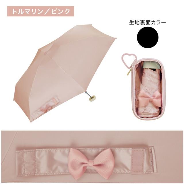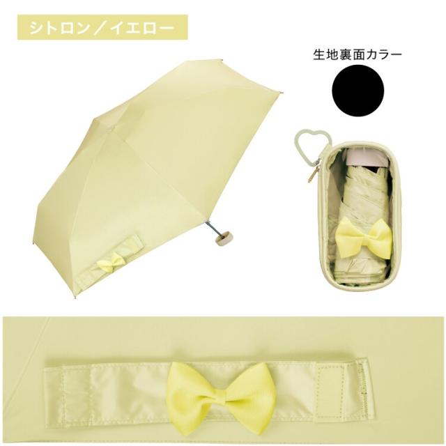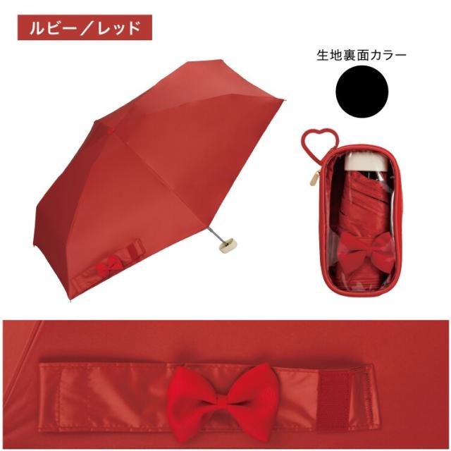 シンプルな無地デザインの傘にリボン付きの帯がワンポイントになっており