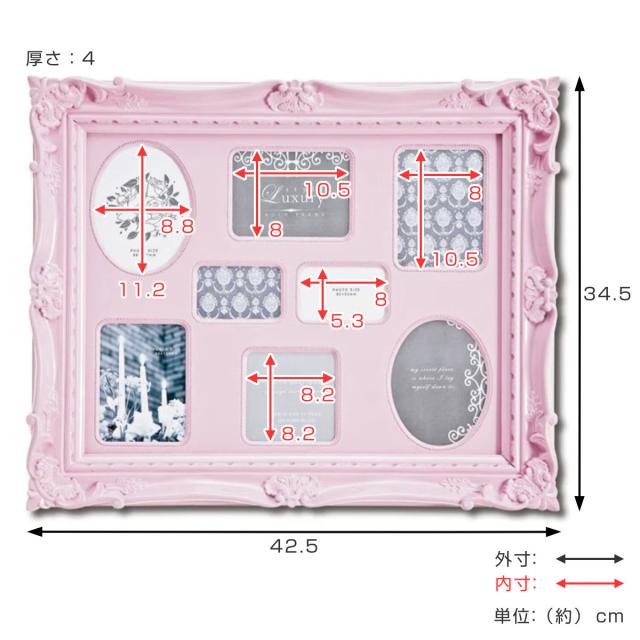 | サイズ | 約 幅42.5×高さ34.5(cm) フレーム厚さ:約 4(cm) 対応写真サイズ: ・約 8×5.3(cm)×2枚 ・約 8.2×8.2(cm)×1枚 ・約 8×10.5(cm)×3枚 ・約 8.8×11.2(cm)×2枚 |
