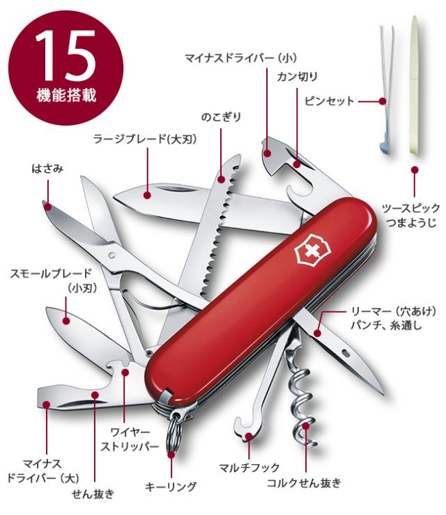 | ブランド |ビクトリノックス / VICTORINOX シリーズ |MEDIUM POCKET KNIVES 品番 |huntsman-15 |レッド:1.3713 |ブラック:1.3713.3 形状 |ナイフ / マルチツール / 防災グッズ / 十徳ナイフ 外寸 |W91×H21×D26[mm] 重量 |約 97g 素材 |ブレード:ステンレススチール |ハンドル:セリドール樹脂 原産国 |スイス 機能 |1.ラージブレード (大刃) / 2.スモールブレード (小刃) |3.コルクせん抜き / 4.カン切り |5.マイナスドライバー(小) 3mm / 6.せん抜き |7.マイナスドライバー(大) 6mm / 8.ワイヤーストリッパー |9.リーマー (穴あけ)/パンチ、糸通し |10.キーリング / 11.ピンセット (毛抜き) |12.ツースピック (つまようじ) / 13.はさみ |14.マルチフック / 15.のこぎり ATTENTION ●サイズはメーカー公称値(許容される最小値と最大値の中心値)です。 |